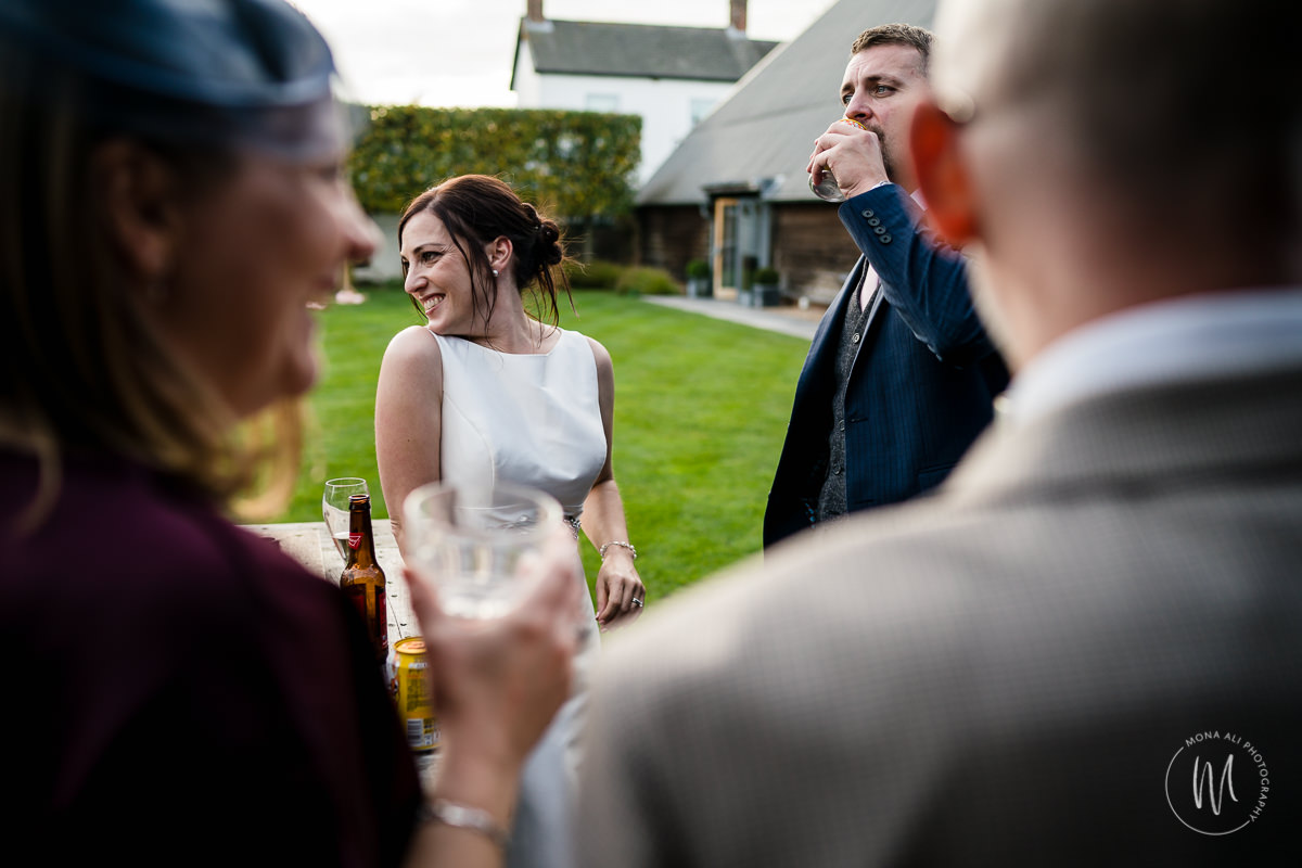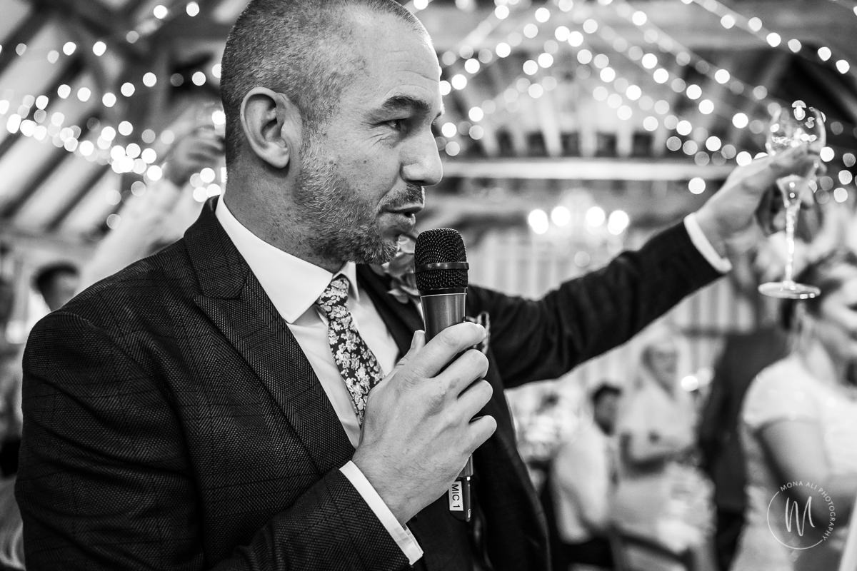 The kiddies handed out the confetti. just in time as the sun reappeared. Guests enjoyed fizz and canapés outside after the confetti run, whilst I got a few family photos done. If you’ve been following my work, you’ll know I’m a sucker for a symmetrical shot so I couldn’t help myself with the gorgeous ones of Clare & Steven near the water feature. A lot of couples tell me the bit they dread the most is having their photo taken. Most worry about feeling awkward, freezing up or getting embarrassed whilst they’re trying to get romantic and snoggy.. So let me bust some myths here – I always take couple photos with just my couples. No bridesmaid tagging along, or uncle Bob shooting over my shoulder. This is your time alone, to just breath and enjoy 10 mins or so away from everyone so we can get some lovely photos of just the two of you. Ideally we’ll spend 10-15 mins together, and we’ll walk and talk as we’re taking some photos in such a relaxed way you’ll honestly forget about any nerves so quickly. I won’t tell you where to put your hand or how to smile, but will just encourage you both to connect, be yourselves and get close. Bring your fizz and relax. Easy! Once the photos were all done, everyone sat down for dinner and Clare & Steven made their grand entrance. There were some cracking speeches, Clare was in tears a few times, and Steven’s best man had the crowd in his hands! After dinner was cocktail hour, and then a quick cake cutting before the dancing started. Time for everyone to get their groove on. You’ll always find me in the middle of the dance floor, trying to get some shots as the band gets going. I really love this end bit of the day. And I might even stay for a glass of vino!