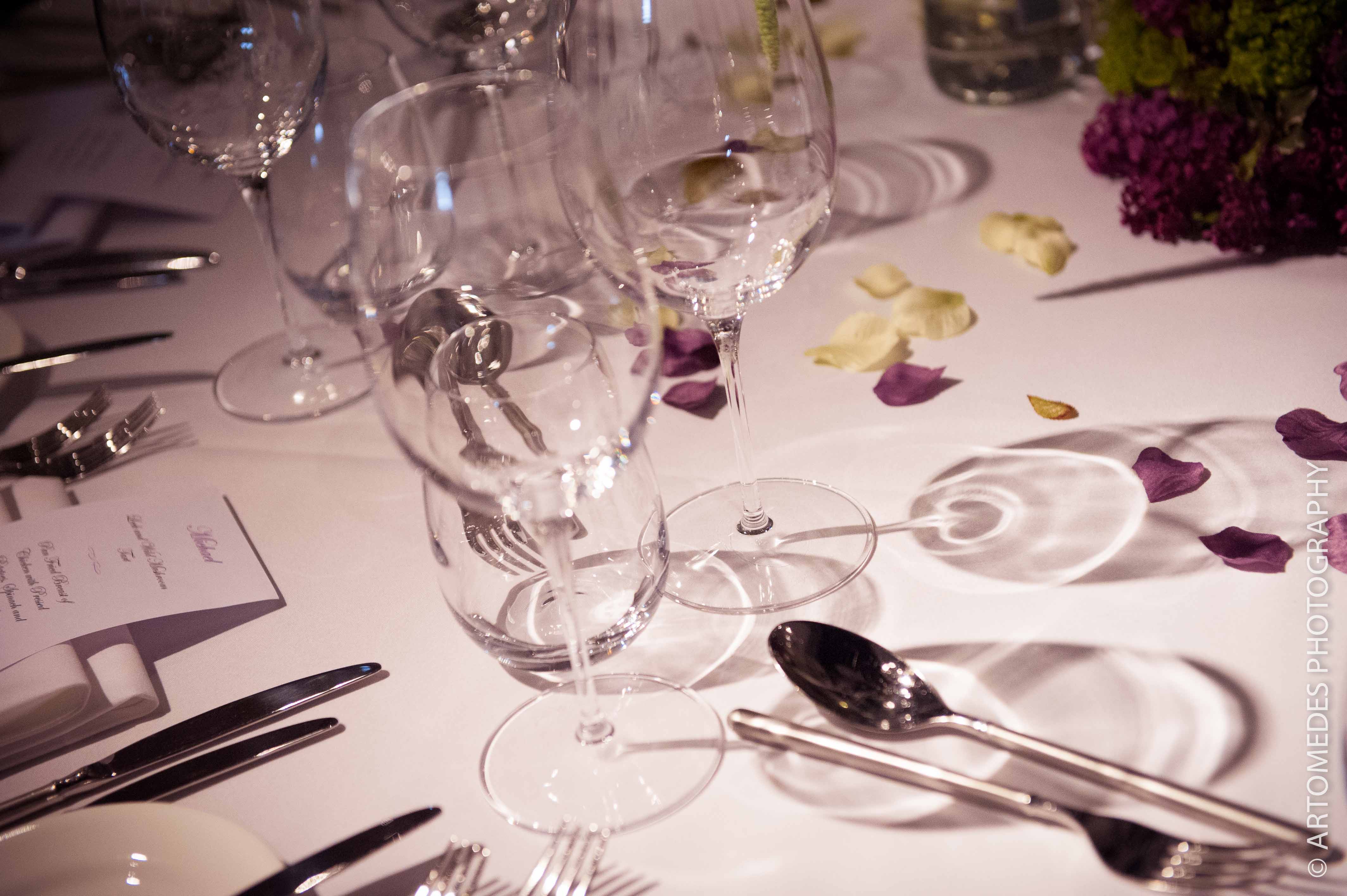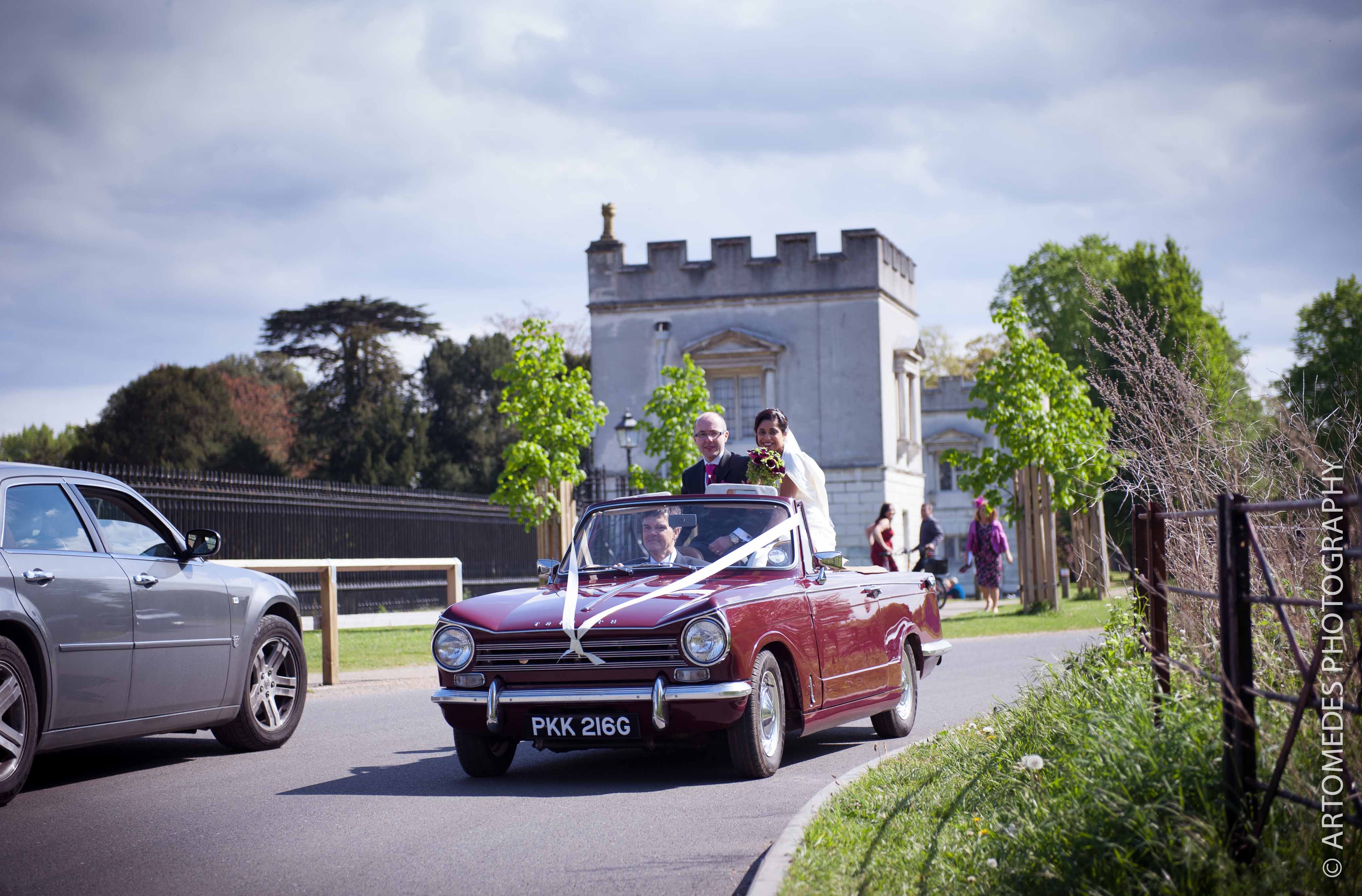 After the emotional ceremony, guests made their way to the Hilton Hotel at Syon Park, whilst Bee & Jason travelled in style and vintage elegance, literally sitting on the back of an immaculate old Triumph Herald. Don’t you just love old cars! Thankfully the drive wasn’t very far. After drinks and delicious canapés on the terrace, the wedding breakfast moved up to the Club House where they’d literally filed the room with flowers. Vases were overflowing with the most gorgeous, scented lilac in various shades of purple, and tree table decorations with hanging lilac and crystals. Totally gorgeous!!