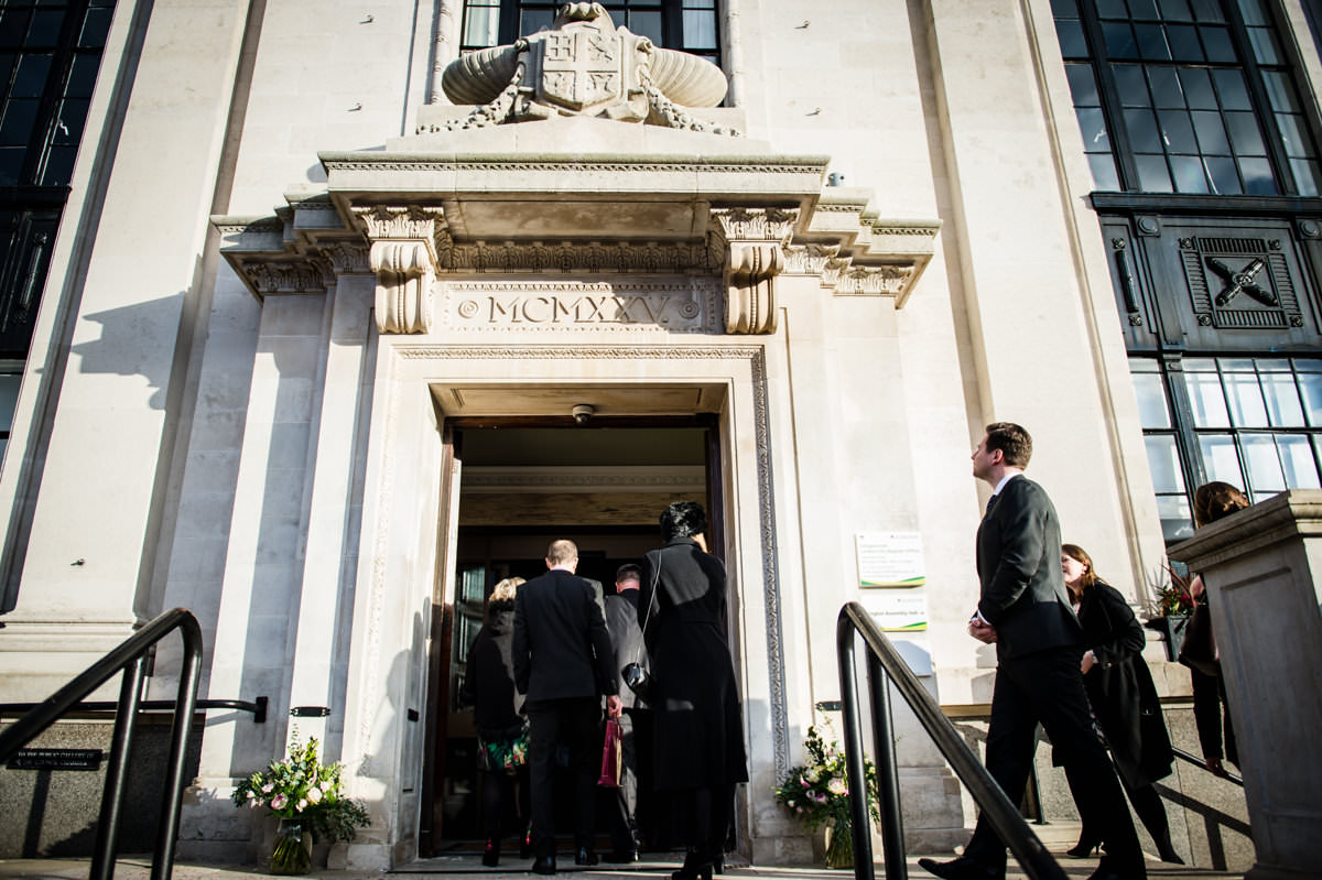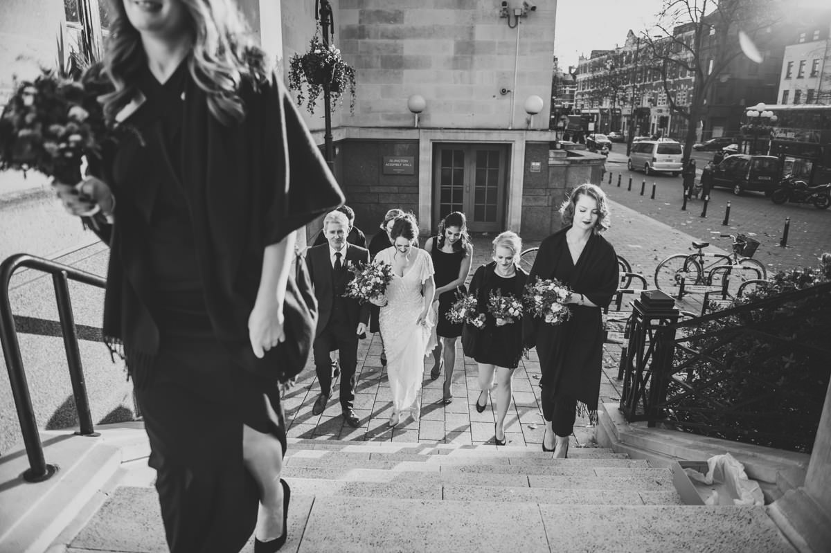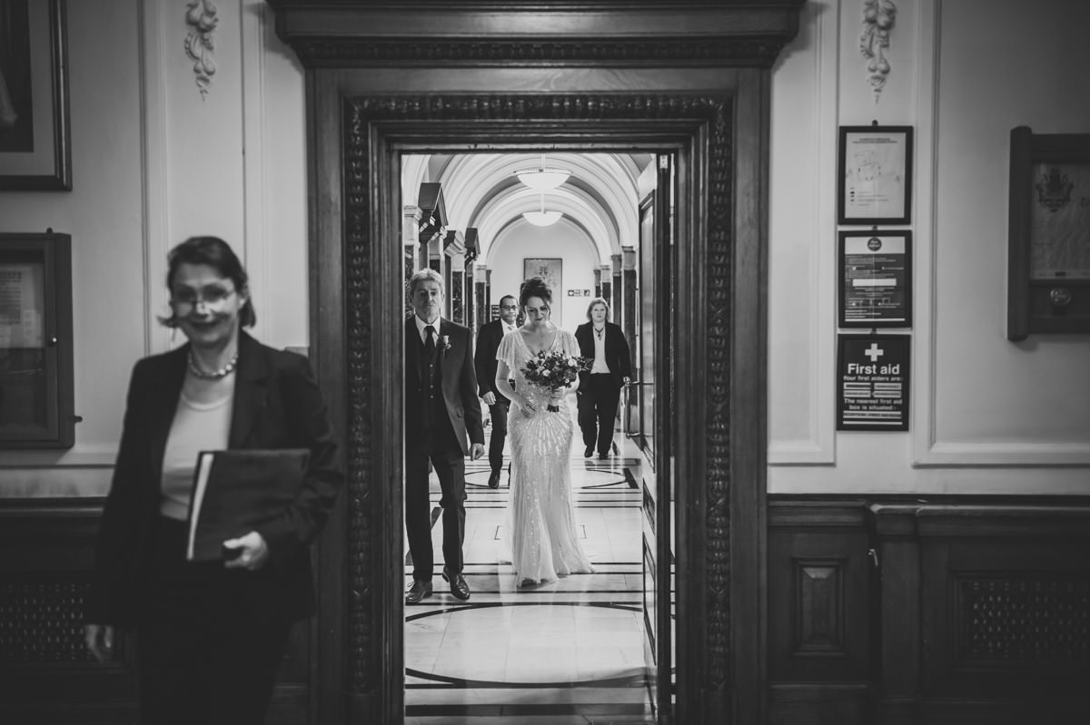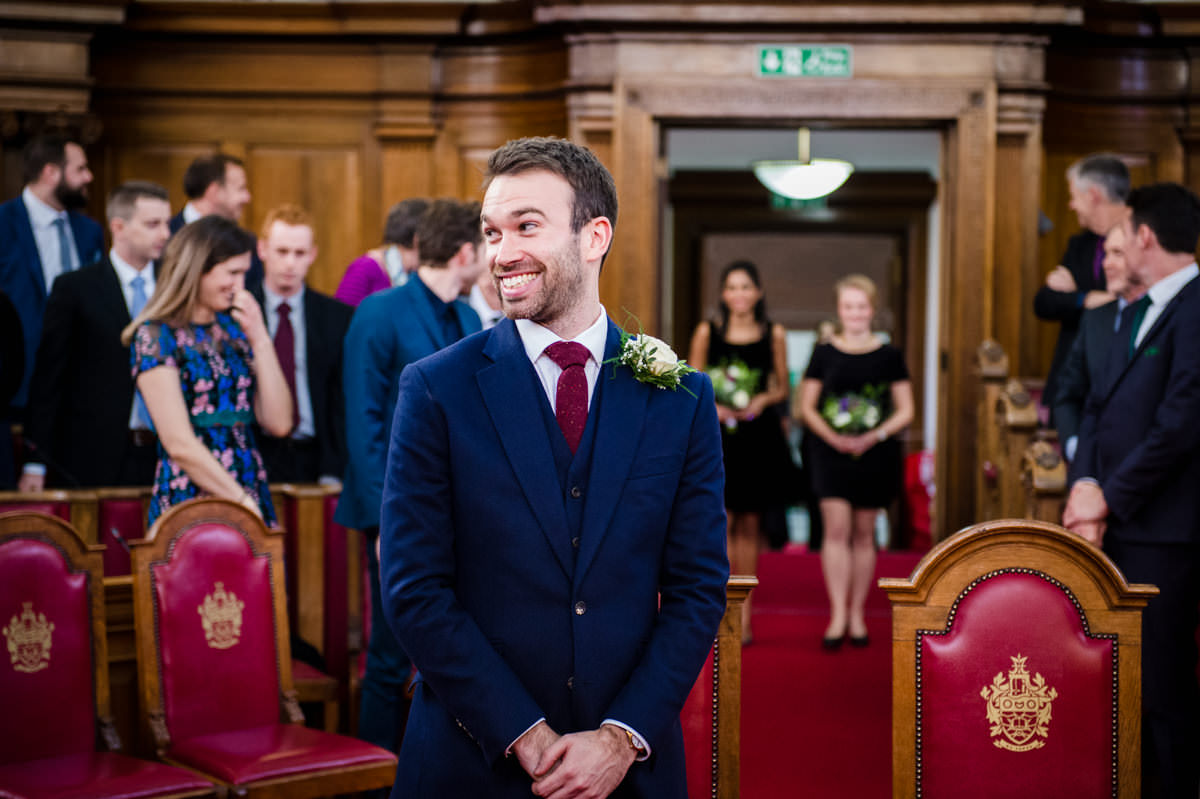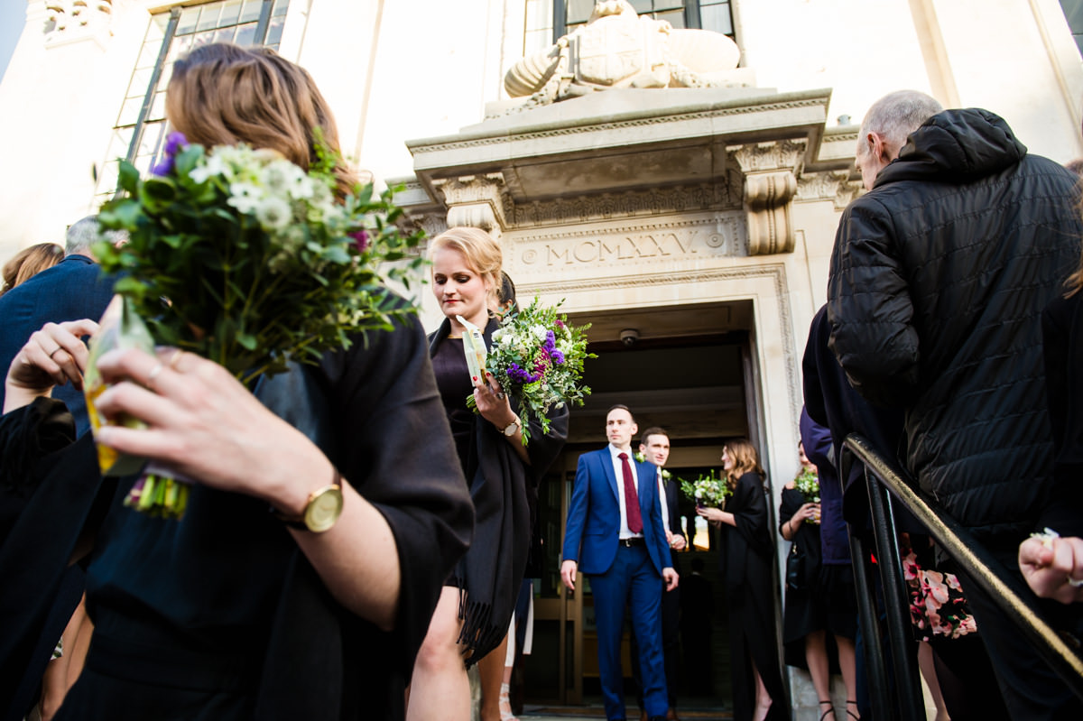 Greg was the second of the Case family brothers to get married and I’d been lucky enough to cover his older brother Nick’s wedding to Catherine the year before (here’s the blog post of their Islington Town Hall & Artisan of Clerkenwell wedding if you want a peek). Greg and his gorgeous partner Lauren, were starting their stylish city wedding at Islington Town Hall and it was great seeing so many familiar faces there again. Greg arrived as guests were gathering pre-ceremony on the steps of the town hall, and button holes were being pinned. And it wasn’t too long before Lauren arrived with her posse of bridesmaids, nervous excitement bubbling away, ready to start the day.