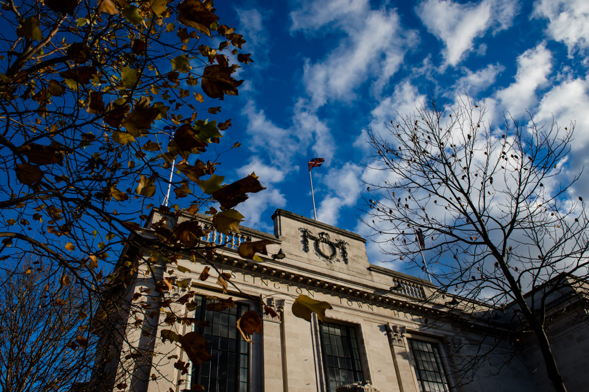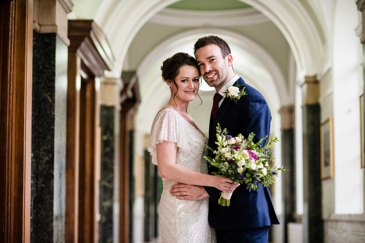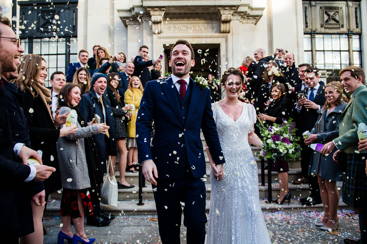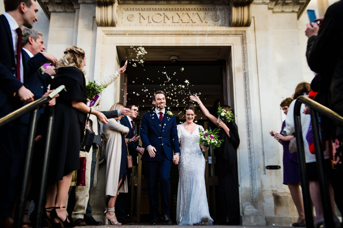 Like many brides, Lauren was a bit nervous about being the centre of attention, something she wasn’t used to. But with the support of her gorgeous bridesmaids and Dad as she walked in looking stunning in her sequinned elegant long dress, her nerves soon dissipated as Greg took her hand and kissed her. Touchingly, both mum’s gave readings and older brother Nick was tasked with being the ring bearer whilst Lauren & Greg made their pledges and commitments to each other. It wasn’t long before they were married and the chamber and gallery, both full with guests who cheered the happy, beaming couple. Then out they all slowly headed to prepare with confetti, as Greg, Lauren and I headed back into the corridors of the town hall for a few photos. I shoot a handful of weddings at this town hall every year and always love its familiar arches and spaces. Back outside into the lovely autumn sunshine, Greg & Lauren stepped into a shower of confetti from guests lining the steps all the way down, with enthusiastic whoops of cheers and congratulations from everyone.