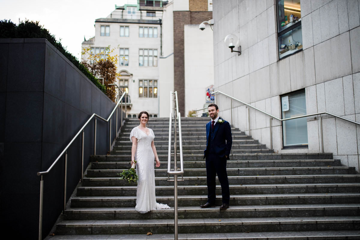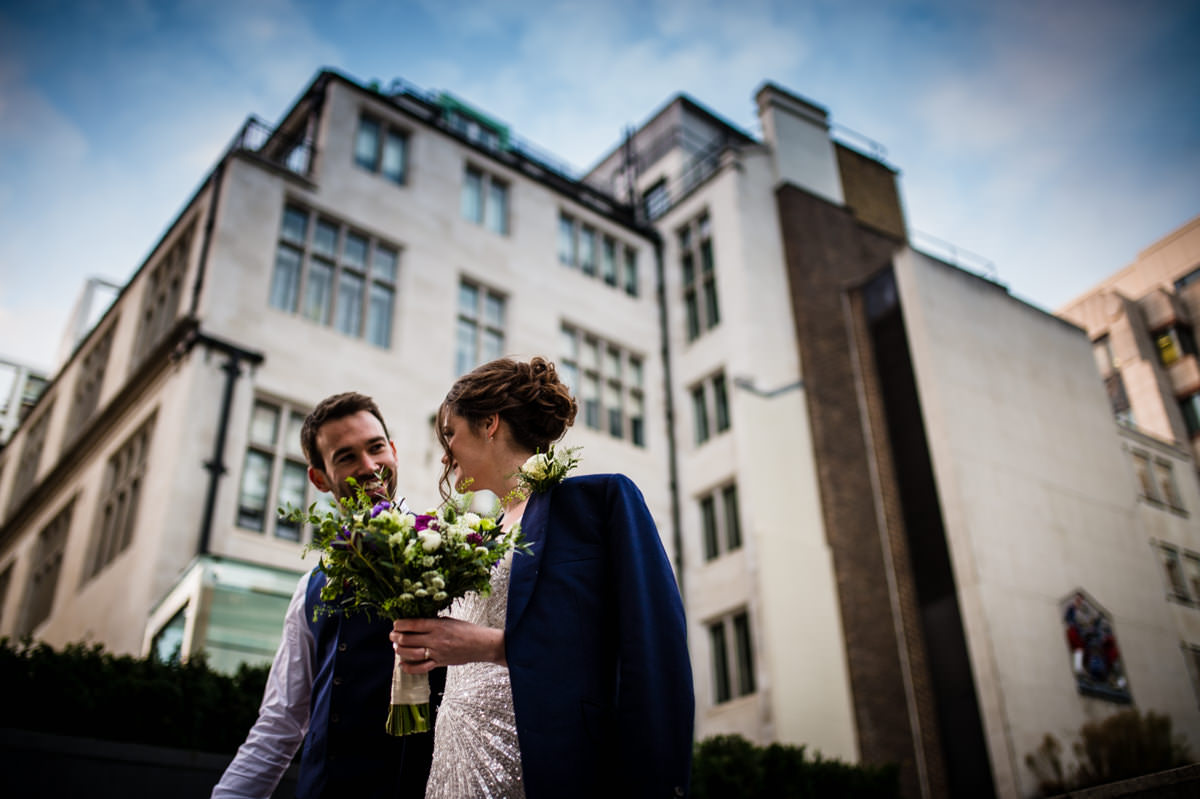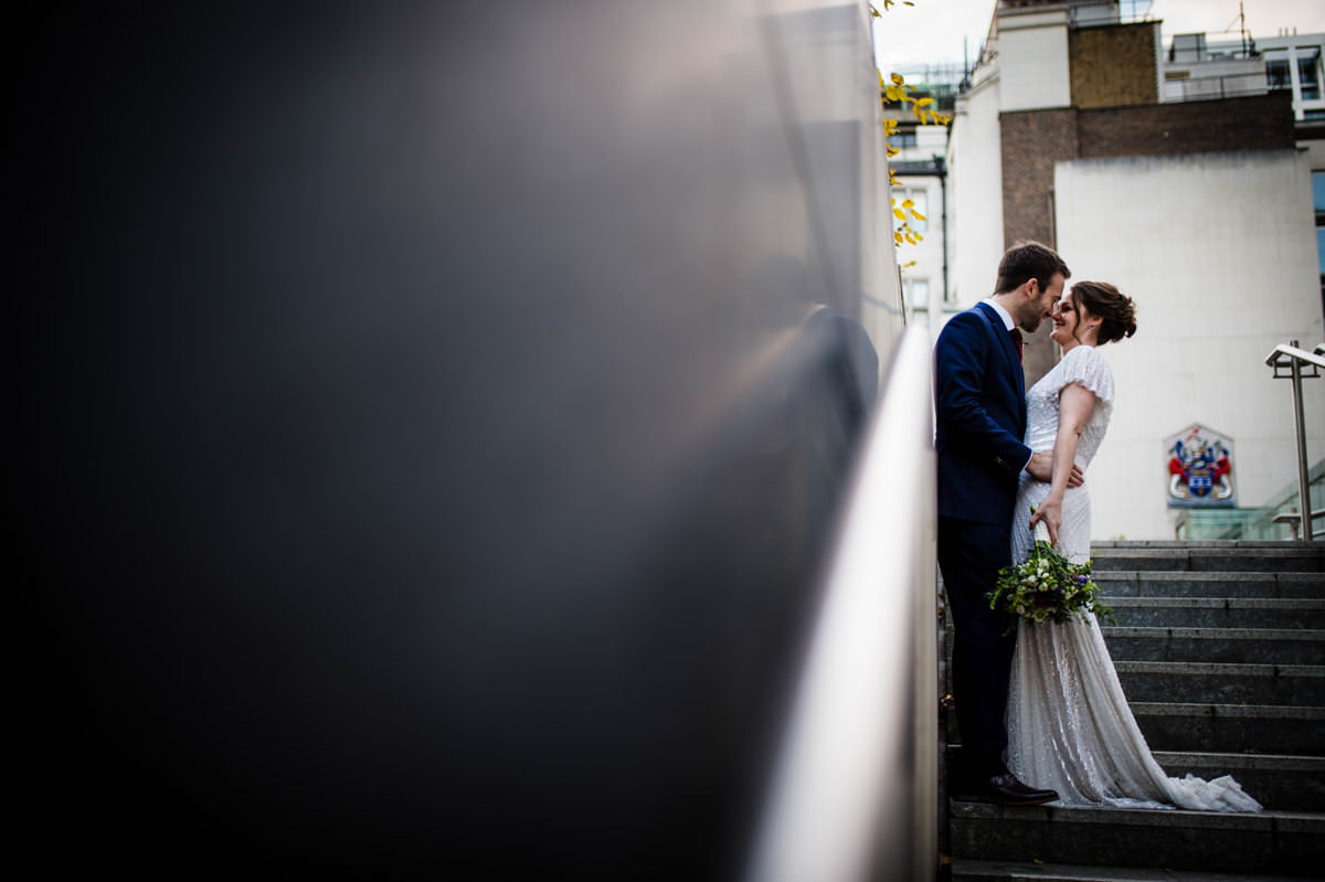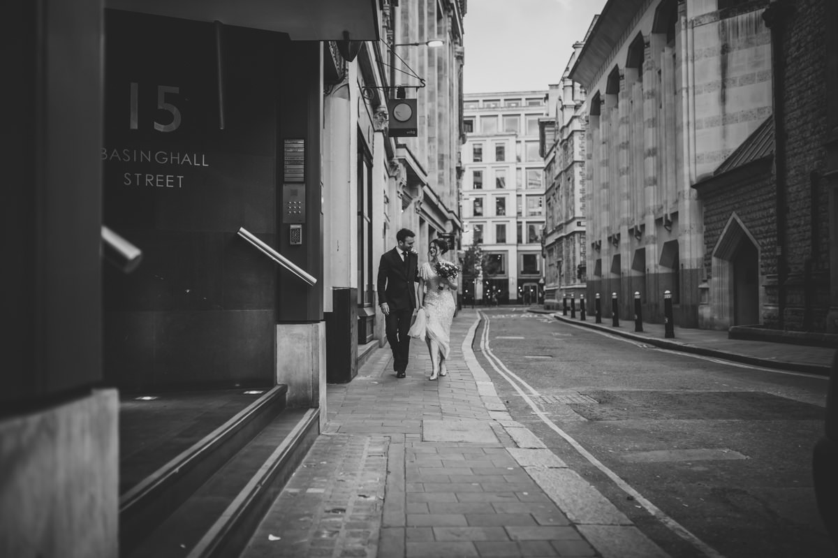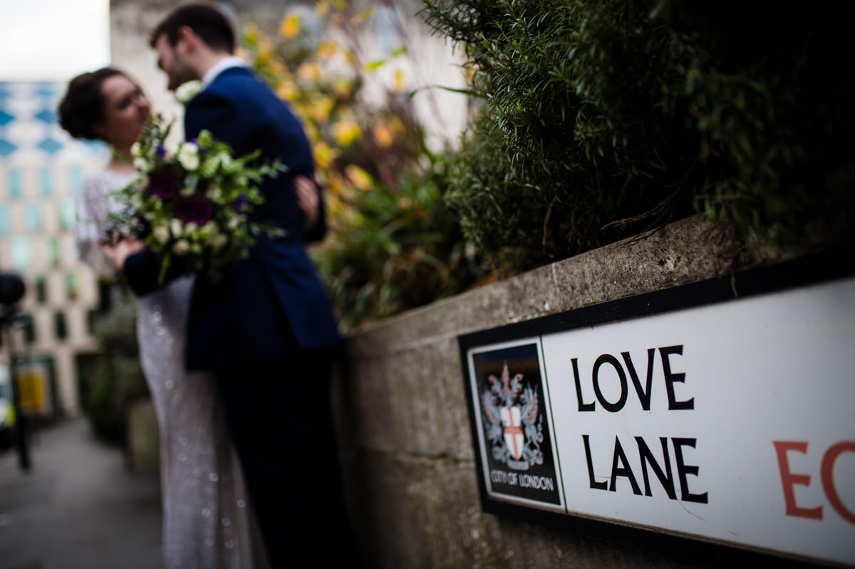 Whilst their guests were whisked off onto red buses for a short tour of London they’d arranged as a treat (as many of them weren’t locals), we headed off into the city. Their reception venue, Hawksmoor Guildhall, was one of their favourite eateries and a great space to celebrate in. As final preparations were underway at the Guildhall, we spent a little time together walking around some of the city streets which was very much part of the attraction of this venue for them both. It was a lifetime ago for me when I worked in the city, commuting daily – familiar with the narrow London streets, the feel of being part of the buzz, finding shortcuts and alleyways from one place to another, being fascinated with the ever changing architecture all around. But today all was quiet as we wandered the deserted city streets enjoying the moments we had together, away from the crowds. It’s something I do with all my couples at their weddings, finding some time and space in the day’s events to just be. And breathe.