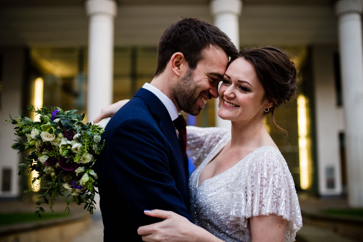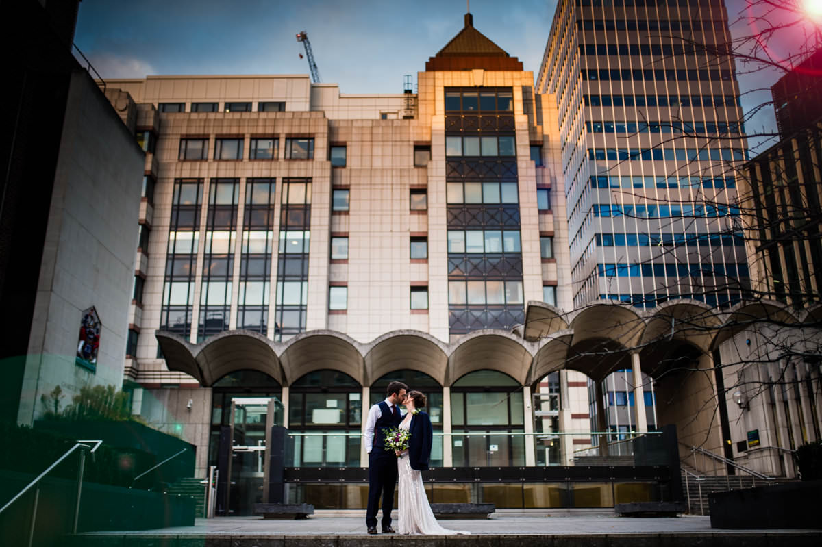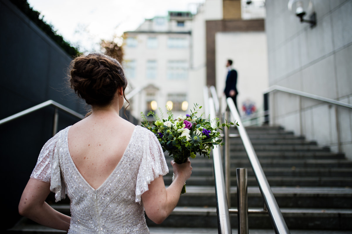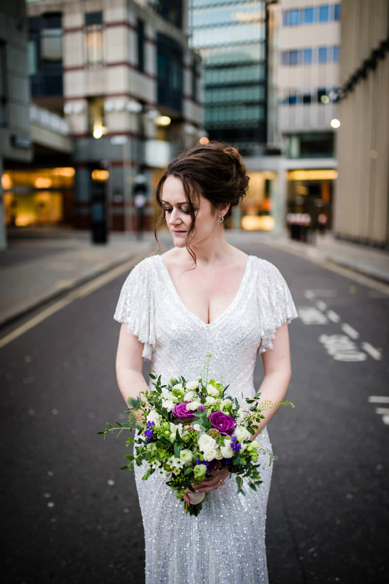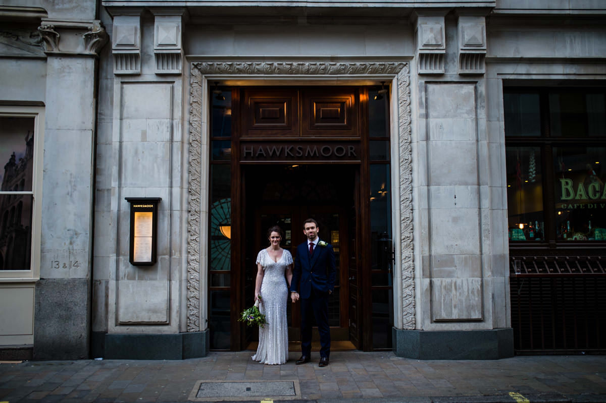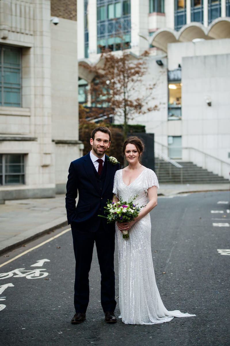 Whilst their guests were whisked off onto red buses for a short tour of London they’d arranged as a treat (as many of them weren’t locals), we headed off into the city. Their reception venue, Hawksmoor Guildhall, was one of their favourite eateries and a great space to celebrate in. As final preparations were underway at the Guildhall, we spent a little time together walking around some of the city streets which was very much part of the attraction of this venue for them both. It was a lifetime ago for me when I worked in the city, commuting daily – familiar with the narrow London streets, the feel of being part of the buzz, finding shortcuts and alleyways from one place to another, being fascinated with the ever changing architecture all around. But today all was quiet as we wandered the deserted city streets enjoying the moments we had together, away from the crowds. It’s something I do with all my couples at their weddings, finding some time and space in the day’s events to just be. And breathe.